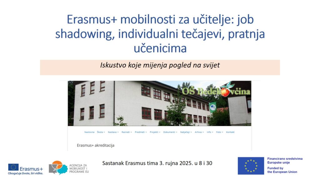 Dana 3. rujna održan je sastanak Erasmus tima Osnovne škole Bedekovčina. Nakon javnog poziva svim djelatnicima škole, objavljenog 16. siječnja 2025., u Erasmus projekt treće godine Akreditacije uključilo se jedanaest djelatnica i djelatnika, koji su se odazvali sastanku.