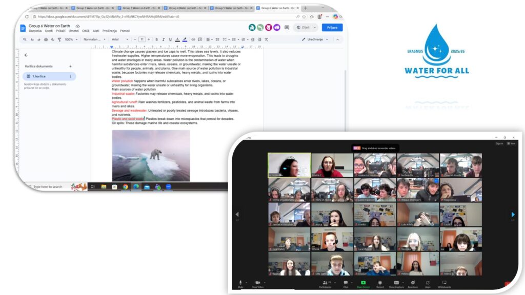 Druga virtualna aktivnost okupila je međunarodne učeničke timove kako bi istražili kako klimatske promjene utječu na vodne resurse. Učenici su surađivali u mješovitim grupama i dijelili svoje nalaze u zajedničkom Google dokumentu.