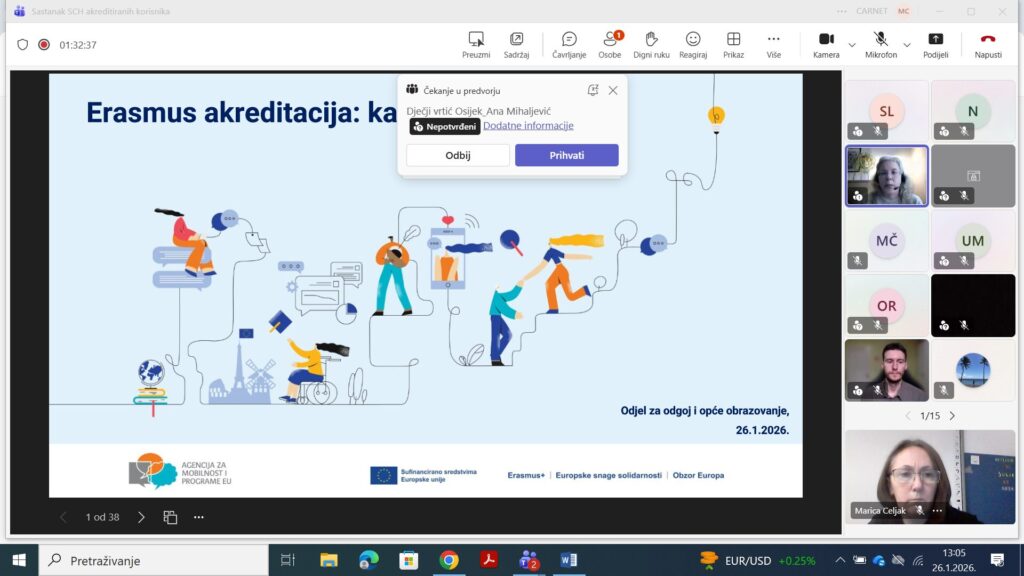U ponedjeljak, 26. siječnja 2026. godine u 13 sati održan je online sastanak svih akreditiranih ustanova u području odgoja i općeg obrazovanja putem platforme Microsoft Teams, na kojem su ispred naše škole sudjelovali ravnatelj Ivan Paradi i koordinatorica Erasmus+ akreditacije.Marica Celjak.