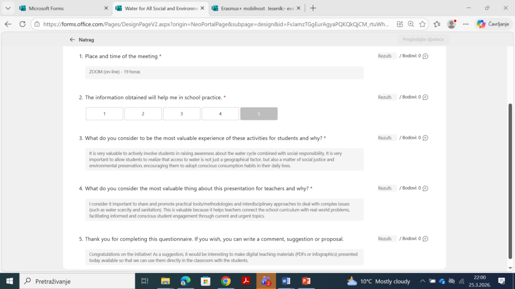 Sudionici su oduševljeni praktičnim primjerima i mogućnošću umrežavanja: “Ovi projekti savršeno spajaju ekologiju s digitalnim vještinama – super za moje učenike!” Drugi su istaknuli: “Naučila sam nove Zoom i eTwinning tehnike; ovo je idealno za inkluzivno obrazovanje u mojoj školi.” Jedan nastavnik iz Grčke dodao je: “Inspirativno za naše lokalne ekološke inicijative – hvala na dijeljenju materijala!”