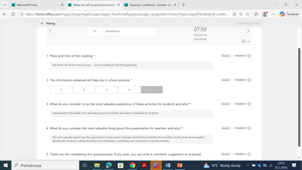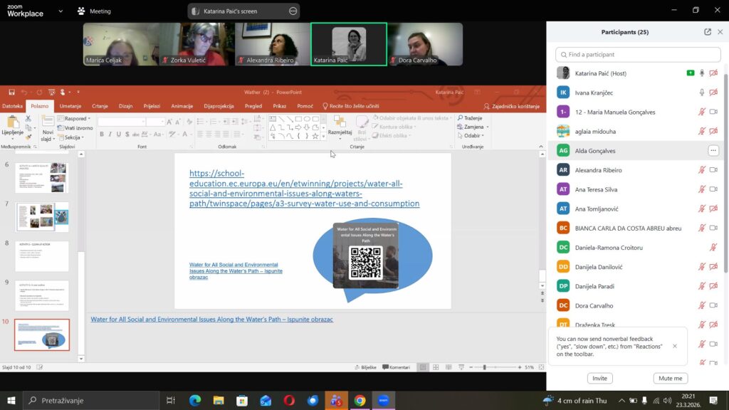 Održan je on-line webinar 23. ožujka 2026. godine u 20 sati putem platforme Zoom, na kojem je sudjelovalo 23 nastavnika iz više europskih zemalja, uključujući Portugal, Španjolsku, Grčku, Srbiju i Hrvatsku.