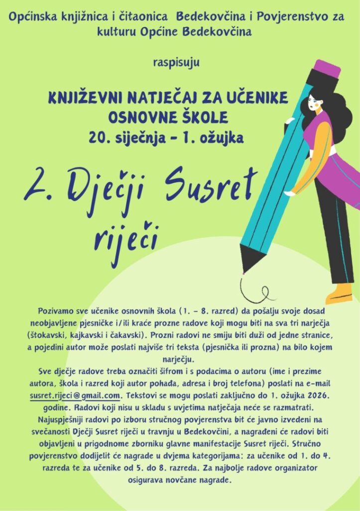 I ove godine raspisuje se natječaj za 2. Dječji Susret riječi, inačicu dugovječne književno-recitalne manifestacije Susret riječi u Bedekovčini. Povjerenstvo za kulturu Općine Bedekovčina poziva sve učenike osnovnih škola (1. – 8. razred) da pošalju svoje dosad neobjavljene pjesničke i/ili kraće prozne radove koji mogu biti na sva tri narječja (štokavski, kajkavski i čakavski). Prozni radovi ne smiju biti duži od jedne stranice, a pojedini autor može poslati najviše tri teksta (pjesnička ili prozna) na bilo kojem narječju.